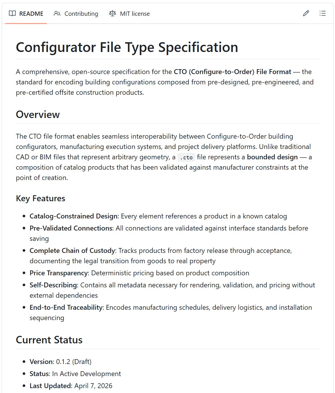 Version 0.1.4 of the CTO file format — the open standard for Configure-to-Order construction developed by the Center for Offsite Construction — now encodes the complete record of responsible parties and their insurers for every building component, from factory floor to final acceptance. Combined with the format's existing chain-of-custody framework, architects, developers, lenders, and legal professionals can trace ownership, risk, and insurance coverage at every stage of a product's journey from manufactured good to real property. The update also introduces a three-layer geometry standard separating spatial envelopes, 3D models, and 2D construction drawings — all within a single open file format designed for Configure-to-Order building delivery.
