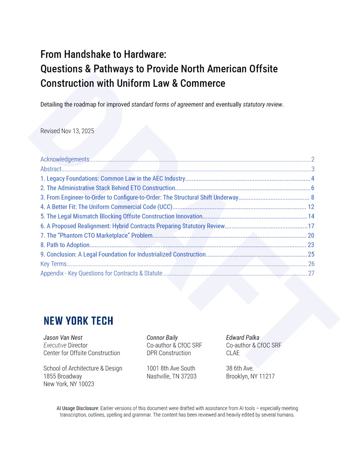 The CfOC has published a major new draft of Handshake, a whitepaper calling for modern legal frameworks to support offsite manufacturing and a true Configure-to-Order (CTO) marketplace. This edition introduces a powerful new Appendix that organizes the key questions statutory reviewers must study to align contracts, warranties, and risk allocation with product-based building delivery. The article on Build Ahead explains why this matters now—and how clarifying the legal “mateline” can accelerate housing production, reduce disputes, and modernize the foundations of construction.